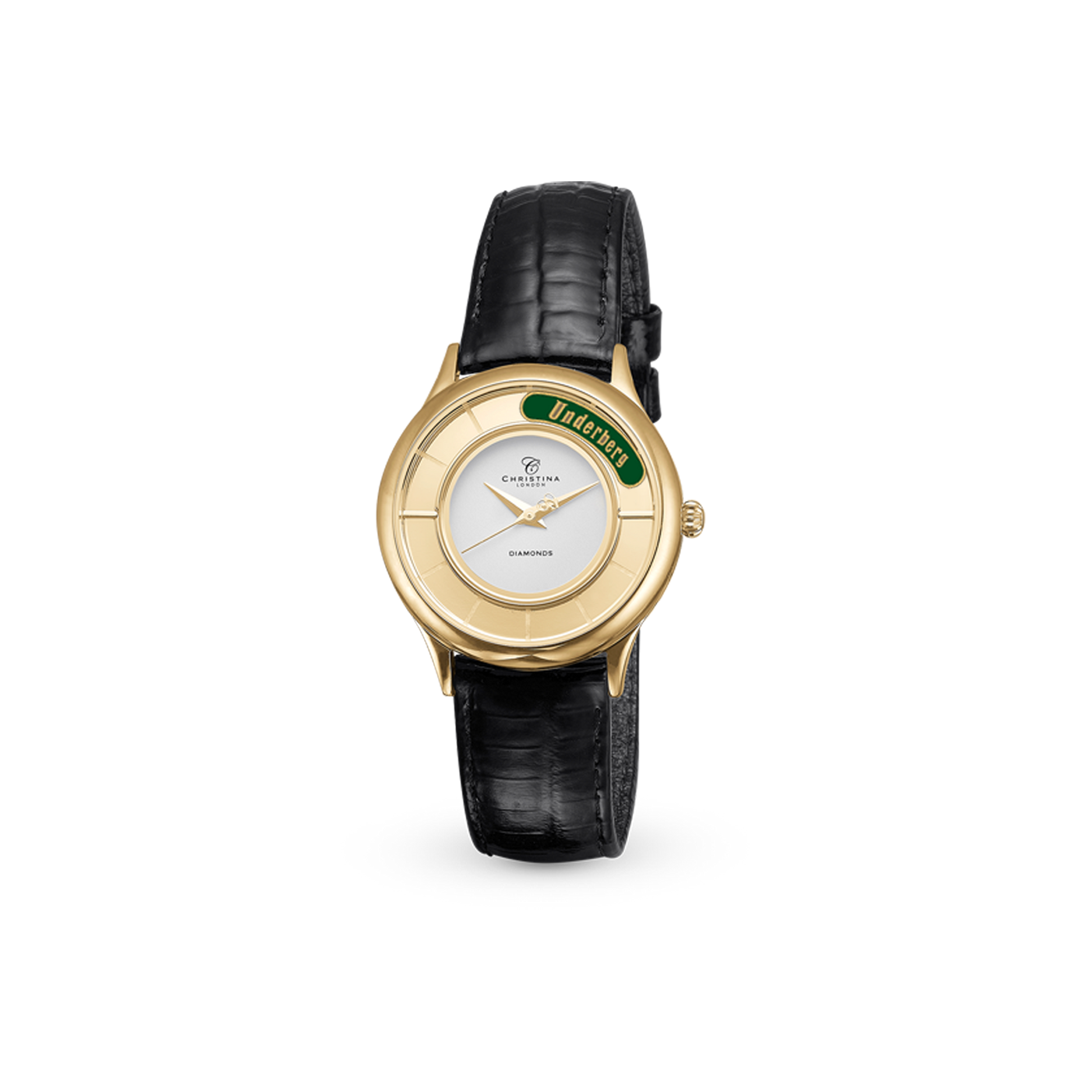 Women's gold plated collect-watch with the black leather strap and the underberg element within. Add the wonderful green strap or the Top Bezels with sparkling white and green stones to your Collect watch.Product information