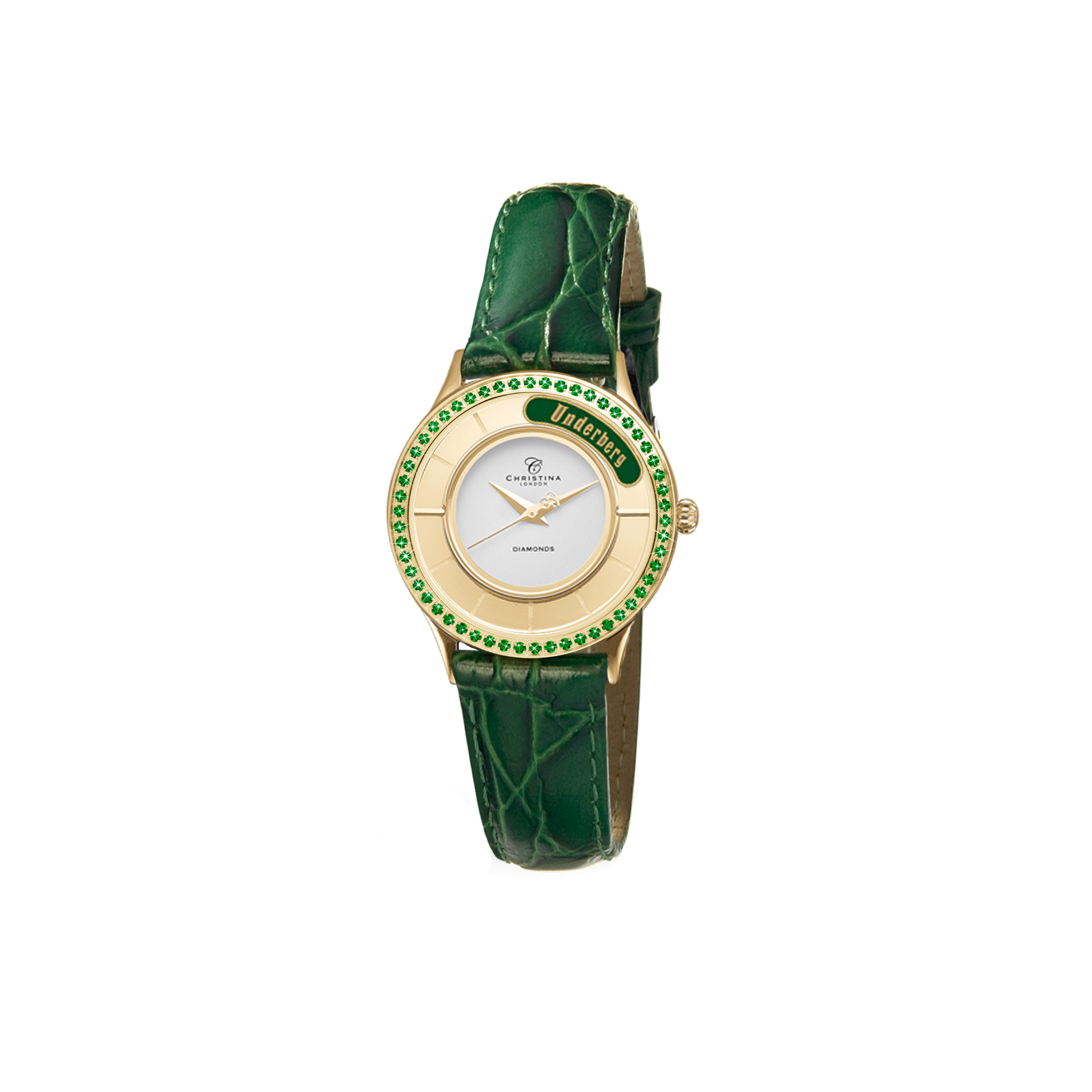 Goldplated Women's watch with green leather strap and Underberg element within the dial. Here you can also ad gemstones in various colours which is available on this website. On the top bezel there are 60 green gemstones and the glass is scratchfree sapphire.